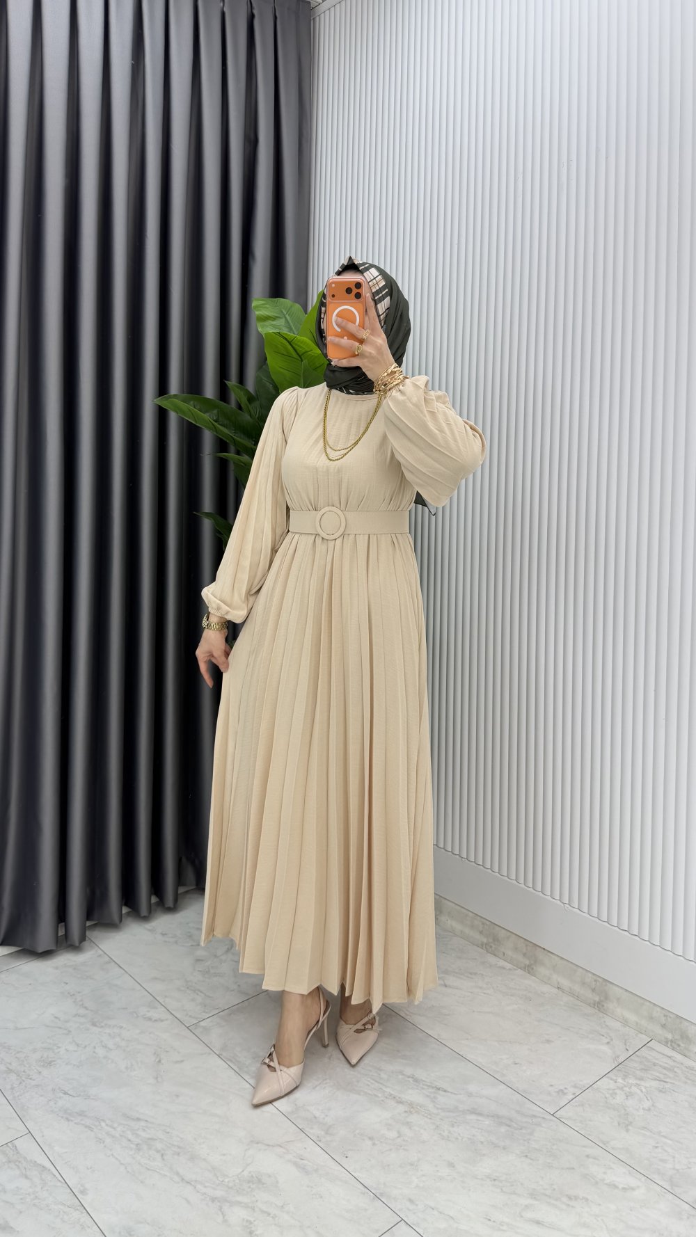 Bej Hifa Piliseli Elbise Tesettür Giyim Bej