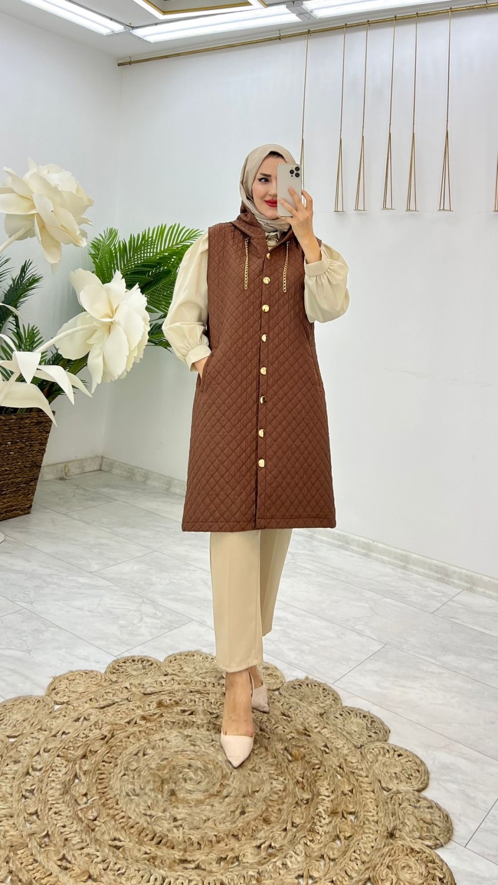 Kahve Kapitone Yüksel Yelek Tesettür Giyim Kahverengi