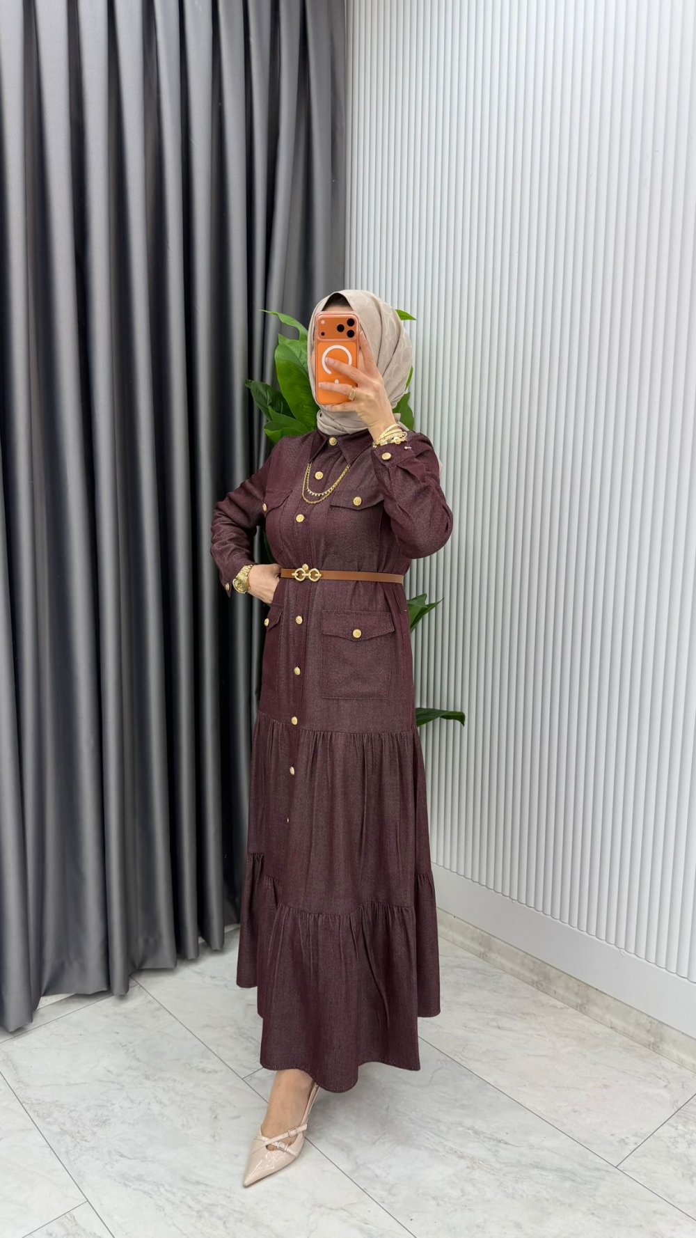 Mürdüm Kemerli Eslem Kot Elbise Tesettür Giyim Mürdüm