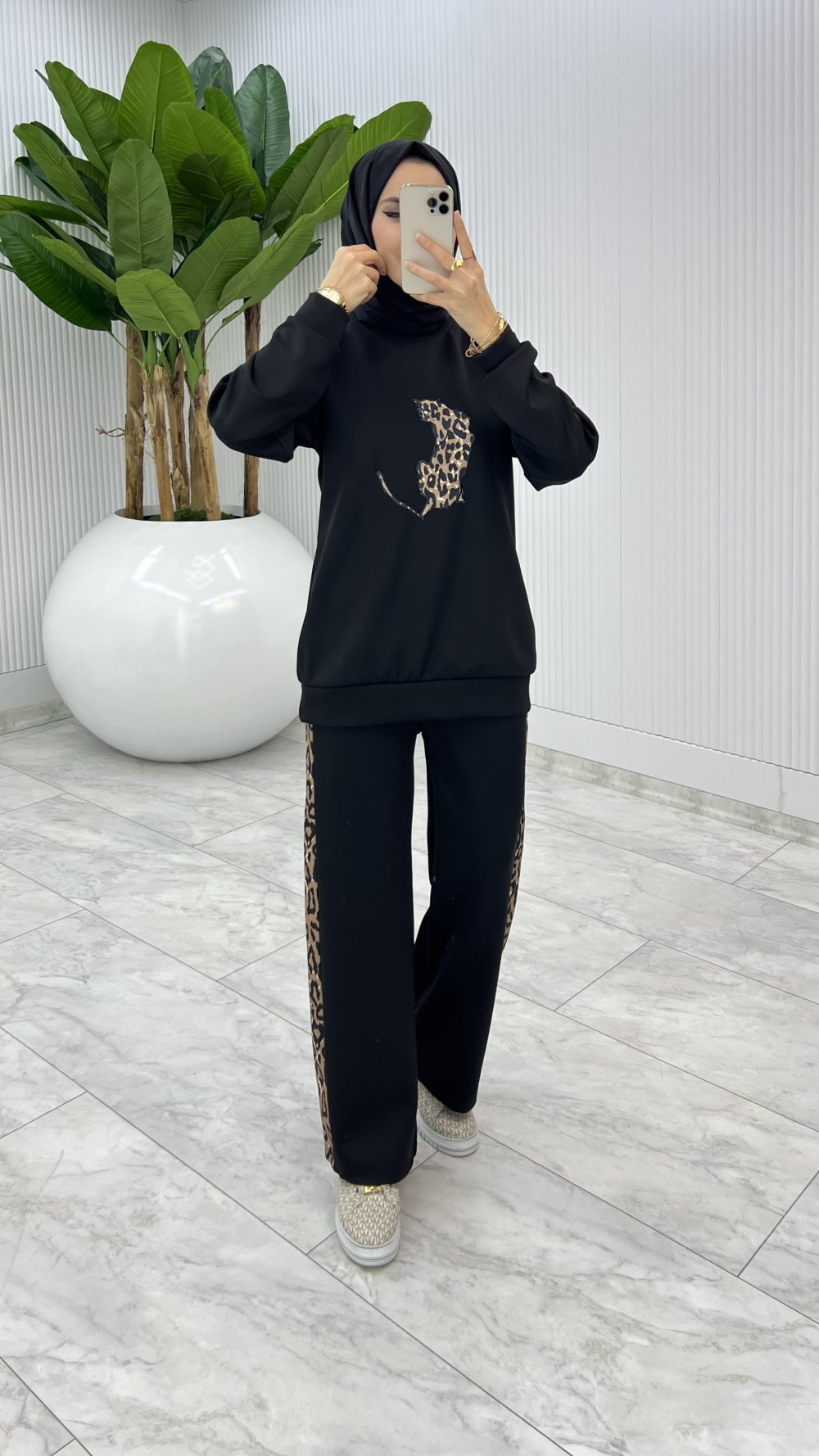 Siyah Leoparlı Scuba Takım Tesettür Giyim Siyah