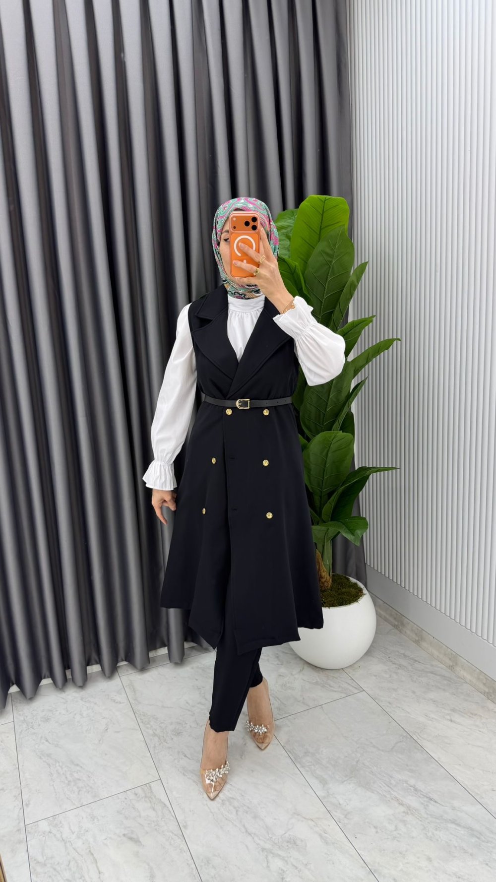 Siyah Tuğba Kemerli Yelek Takım Tesettür Giyim Siyah