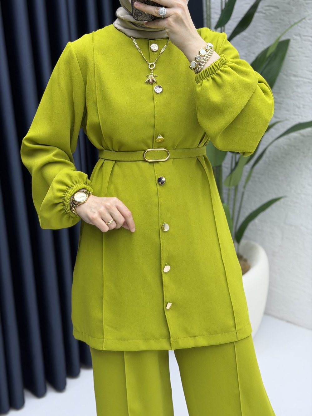Zennup Pantalonlu Takım Tesettür Giyim Yağ Yeşili